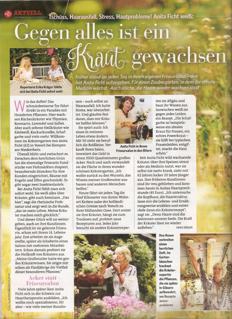Anita Ficht, Gründerin des Kräutergartens Kempen, gehört seit vielen Jahrzehnten zu den prägenden Persönlichkeiten der traditionellen Kräuterkunde am Niederrhein. Ihr tiefes Wissen über Heilpflanzen, natürliche Wirkstoffe und traditionelle Verarbeitungstechniken hat sie über ein langes Berufsleben hinweg stetig erweitert und verfeinert. Dabei verbindet sie historische Heilpflanzenkunde mit moderner, praktischer Anwendung, stets mit dem Anspruch, Naturwissen verantwortungsvoll in die heutige Zeit zu übertragen.